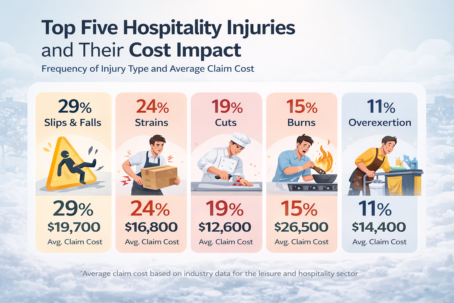 In recent reporting years, nonfatal workplace injuries in leisure and hospitality generated more than $3 billion annually in direct costs. (Source: Liberty Mutual Workplace Safety Index)