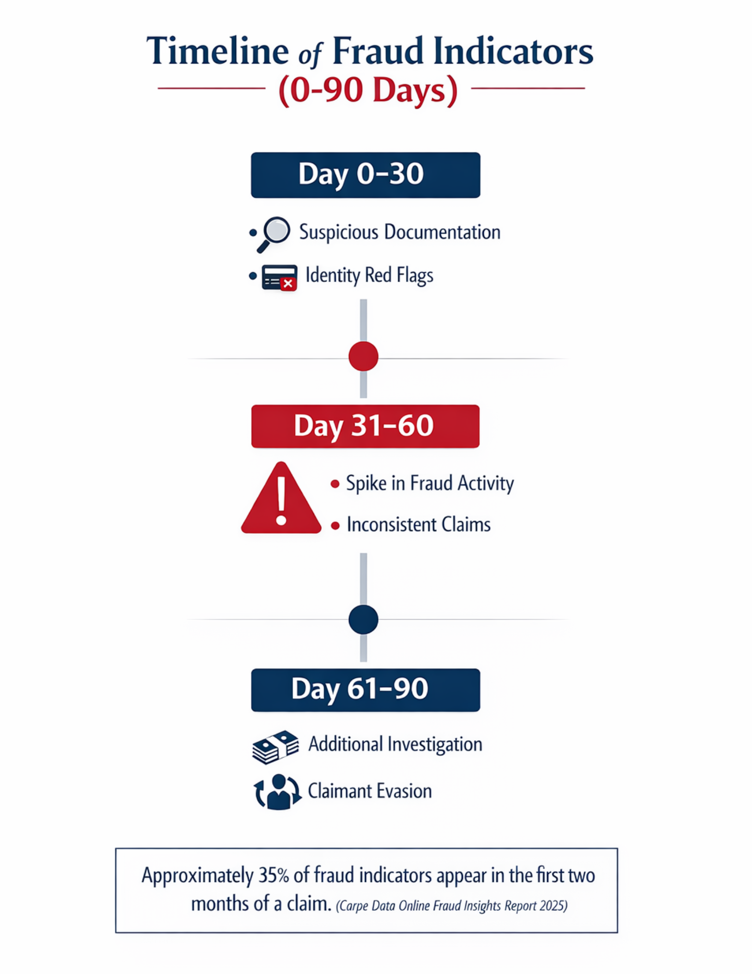 A disproportionate share of fraud indicators appears within the first 60 days of a claim.
